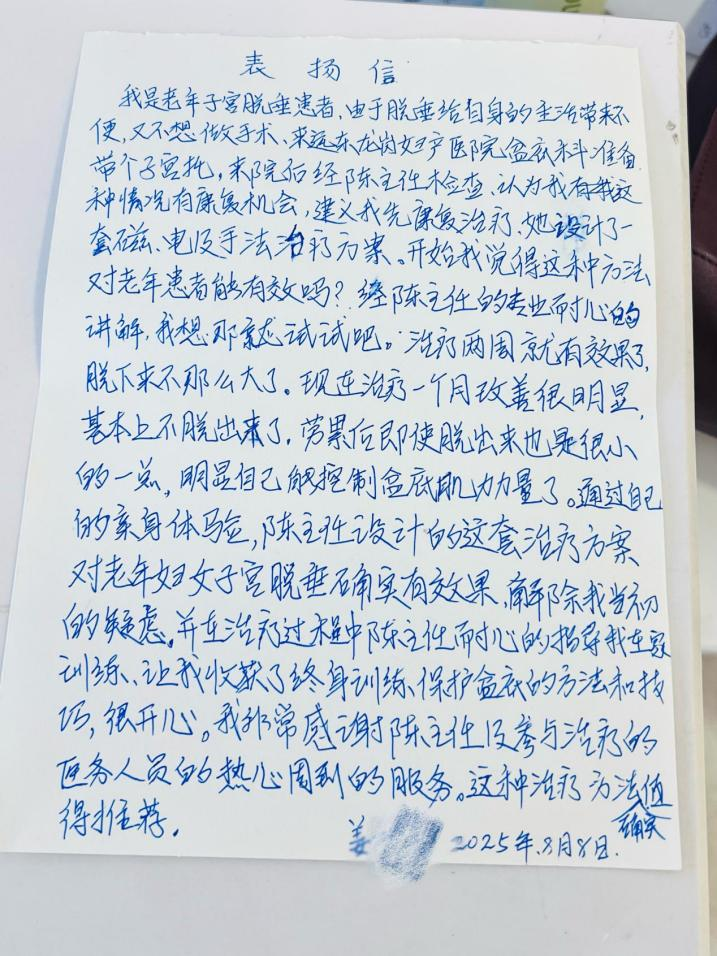 8月初,姜阿姨到院治疗带来了一封亲笔写的感谢信,信中没有华丽的辞藻,却字字真挚“非常感谢陈主任及参与治疗的医护人员...”如今她笑容灿烂,再也看不到往日的拘谨,不仅重获健康,还时常主动鼓励有类似困扰的老姐妹就医:“这不是羞耻的事,就像感冒要治一样简单。”